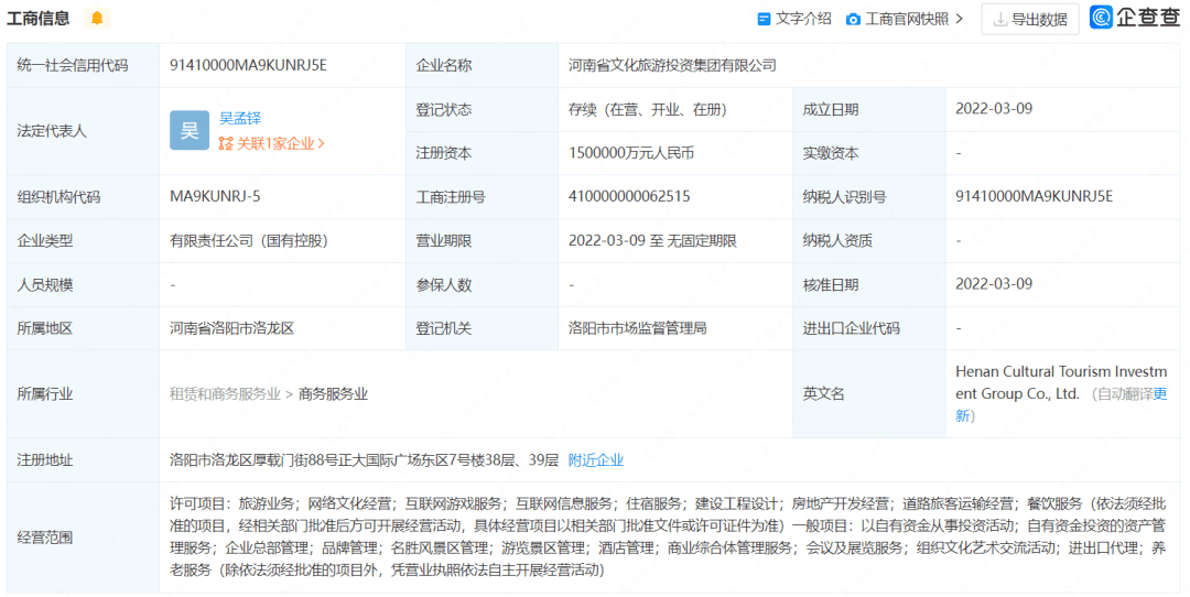 此前的2021年12月,河南政府宣布大力推动企业上市挂牌,力争从2022年起五年内,每年新增境内外上市公司20家;2022年2月,2022年河南省文化和旅游工作会议召开时,会上提出了“培育旗舰劲旅”落实方向,其中包括“组建省文化和旅游投资集团,支持省内文旅企业整合上市”的关键性内容。故在业内看来,上述两家注册在洛阳的国企文旅集团成立,正是与此相呼应。