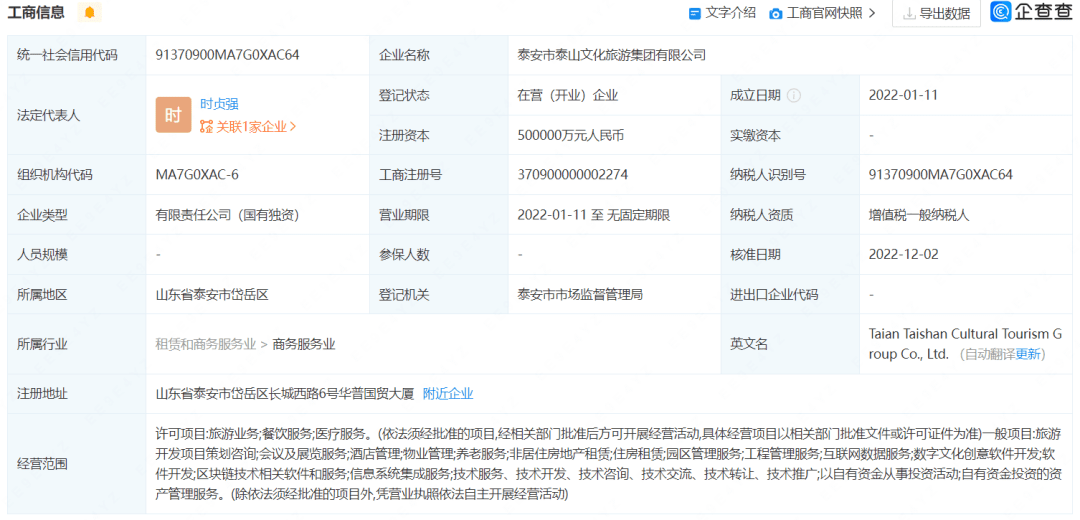 2022年1月18日,泰安市市属企业集团成立大会暨金融助推高质量发展战略合作签约仪式举行,会上泰安市宣布成立包括泰安市泰山文化旅游集团有限公司(以下简称泰山文旅集团)在内的四家新的市属国企,根据企查查,该集团注册资本高达50亿元。