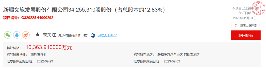 9月29日,上海联合产权交易所一则股权转让信息引发业内关注,中国建材集团旗下的新疆天山水泥股份有限公司与中国中材集团有限公司,将其合计持有的新疆文旅发展股份有限公司(以下简称“新疆文旅”)34255310股股份(占总股本的12.83%),以10363.91万元的价格挂牌转让。