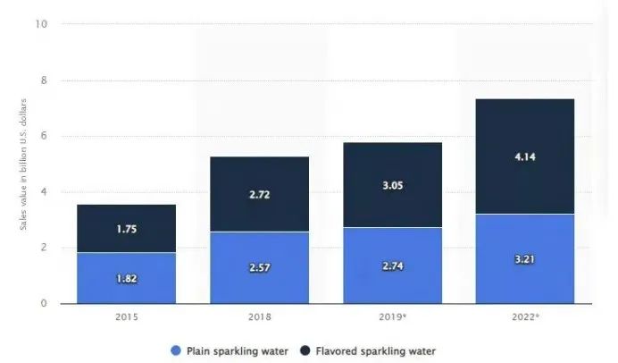 这样的预测似乎正在被一步步印证。据statista数据显示,美国2015年普通气泡水、风味气泡水销售额分别为18.2亿美元、17.5亿美元,到2022年,普通气泡水销售额达32.1亿美元,风味气泡水达41.4亿美元左右。