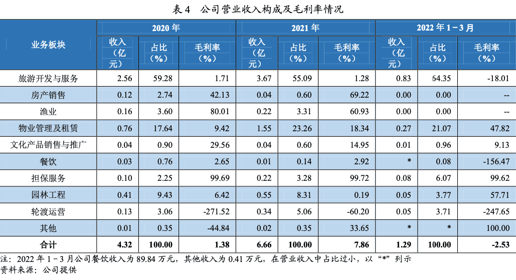 具体来看,武汉体旅集团2021年营业收入同比大涨,主要归因于旅游业从疫情中逐步恢复和中国(武汉)文化旅游博览会(以下简称“武汉文博会”)的举办(2021年,武汉旅体集团共确认文博会展业务收入0.40亿元,带动其他旅游业务收入大幅增长。),在此影响下,武汉旅体集团旅游开发与服务业务收入同比增长43.37%至3.67亿元,占总营收比值为55.1%;且目前该业务板块毛利率极低,仅为1.28%。