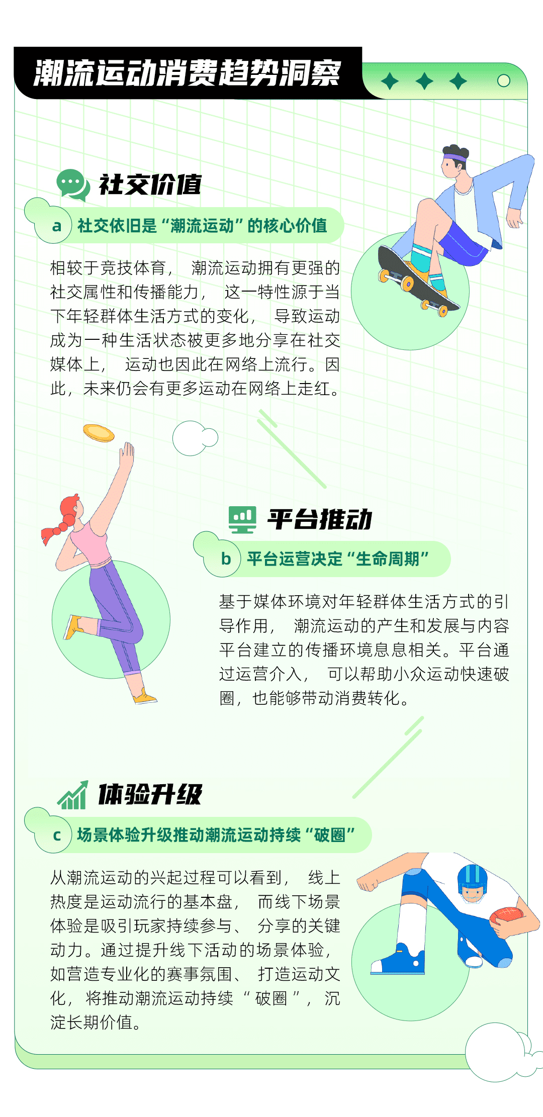 通过对潮流运动内容传播规律的观察可以看到,无论是参与运动获得“社交货币”,还是借助线下活动拓展社交人脉,潮流运动对于入门玩家而言,其社交属性更强于运动属性。因此,社交价值作为潮流运动快速崛起的原因,也将是2023年以及未来更多小众运动实现“破圈”的必要条件。