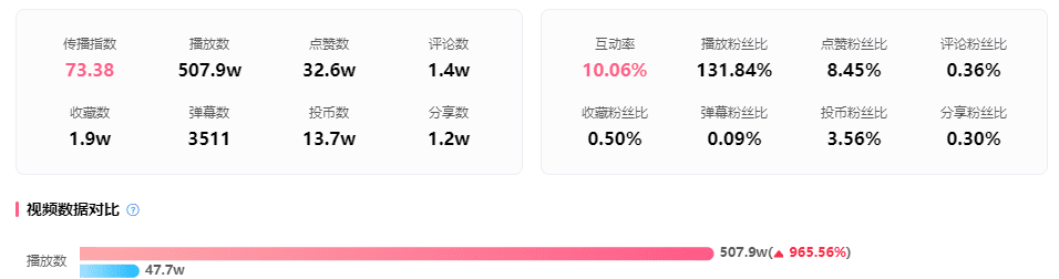 还有停更说明暴涨到507.9w的UP主靠脸吃饭的徐大王,飞瓜数据(B站版)显示这支作品的传播指数高达73.38,互动率10.06%,可见作品传阅范围之广,他还上了此次事件的封面,更是成为了大家关注的焦点中心。