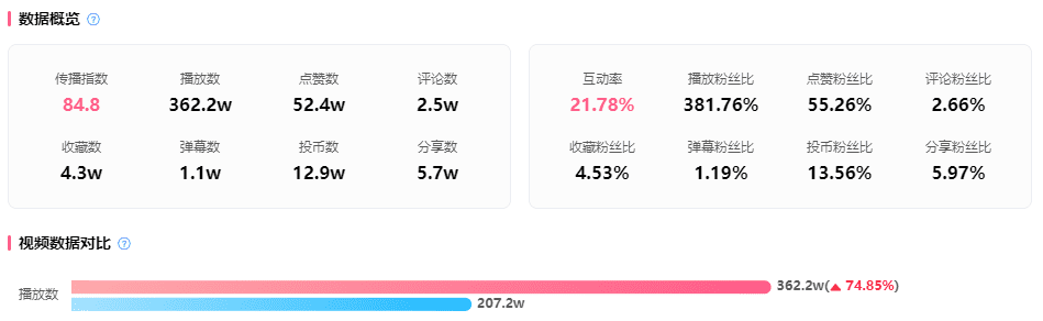 这支作品发布之后粉丝量不到百万的UP主拿下了362.2w的播放数,互动率高达21.78%,其中点赞破50w,投币近13w。