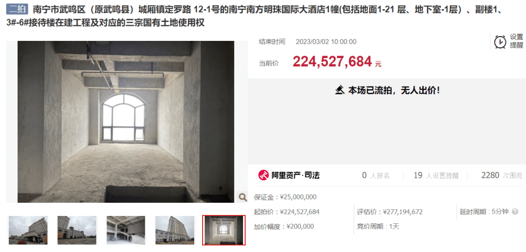 3月2日,据相关拍卖网站显示,南宁市武鸣区城厢镇定罗路12-1号的南宁南方明珠国际大酒店1幢、副楼1、3#-6#接待楼在建工程及对应的三宗国有土地使用权因无人出价而流拍,起拍价约2.24亿元。