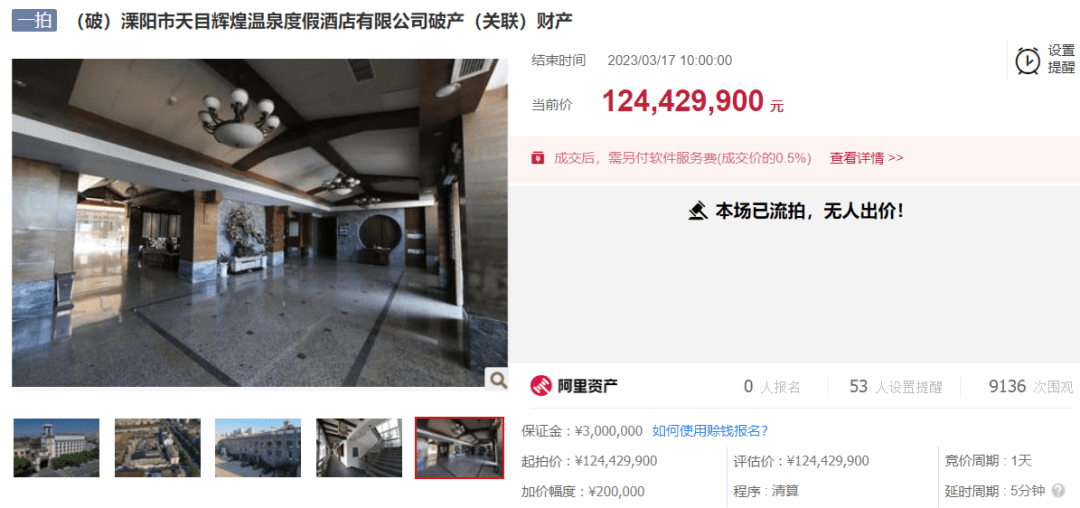 3月17日,据阿里资产·司法拍卖网消息,溧阳市天目辉煌温泉度假酒店有限公司破产(关联)财产第一次拍卖结束,起拍价为1.24亿元,标的评估价为1.24亿元。