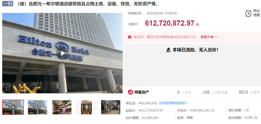 3月30日,阿里资产拍卖网消息,合肥元一希尔顿酒店建筑物及占用土地、设备、存货、无形资产等第一次拍卖因无人出价而流拍,起拍价6.12亿元。